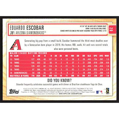 This is a 2019 Topps Big League Eduardo Escobar baseball card. The card is #29 and pictures show condition.