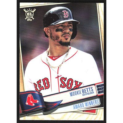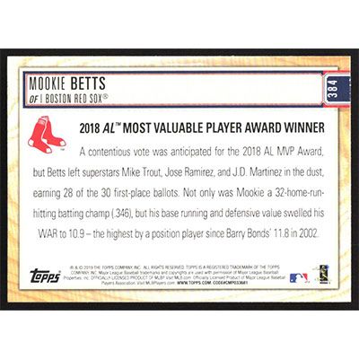 This is a 2019 Topps Big League Mookie Betts baseball card. The card is #384 and pictures show condition.