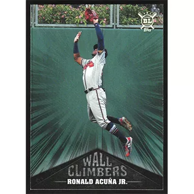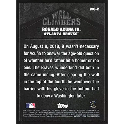 This is a 2019 Topps Big League Wall Climbers Ronald Acuña Jr. baseball card. The card is #WC-2 and pictures show condition.