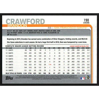 This is a 2019 Topps Chrome Brandon Crawford baseball card. The card is #190 and pictures show condition.