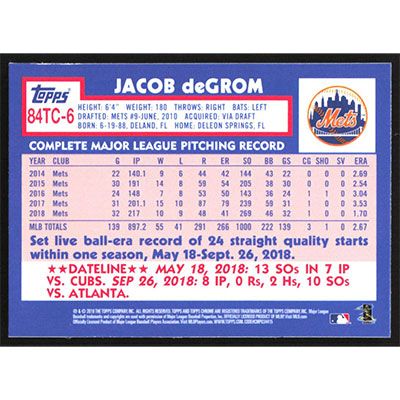 This is a 2019 Topps Chrome '84 Jacob deGrom baseball card. The card is #84TC-6 and pictures show condition.