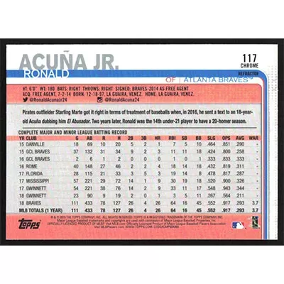 This is a 2019 Topps Chrome Pink Refractor Ronald Acuña Jr. baseball card. The card is #117 and pictures show condition.