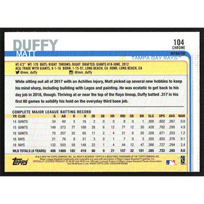 This is a 2019 Topps Chrome Pink Refractors Matt Duffy baseball card. The card is #104 and pictures show condition.