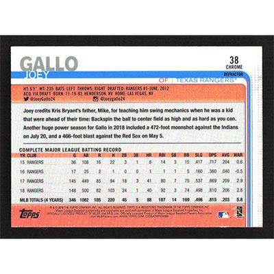 This is a 2019 Topps Chrome Pink Refractors Joey Gallo baseball card. The card is #38 and pictures show condition.