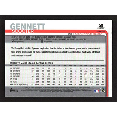 This is a 2019 Topps Chrome Pink Refractors Scooter Gennett baseball card. The card is #58 and pictures show condition.
