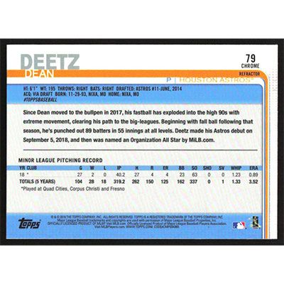This is a 2019 Topps Chrome Pink Refractors Dean Deetz baseball card. The card is #79 and pictures show condition. Team(s): Houston Astros Rookie Card (RC)