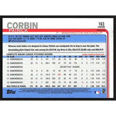 This is a 2019 Topps Chrome Sepia Refractors Patrick Corbin baseball card. The card is #163 and pictures show condition.