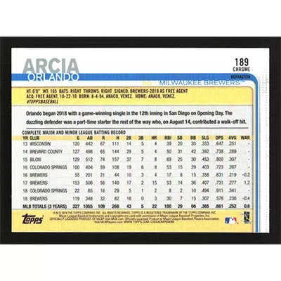 This is a 2019 Topps Chrome Sepia Refractors Orlando Arcia baseball card. The card is #189 and pictures show condition.