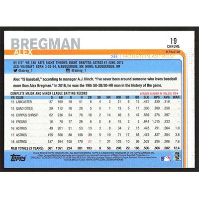 This is a 2019 Topps Chrome Sepia Refractors Alex Bregman baseball card. The card is #19 and pictures show condition.