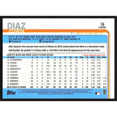 This is a 2019 Topps Chrome Update Pink Refractors Edwin Diaz baseball card. The card is #16 and pictures show condition.