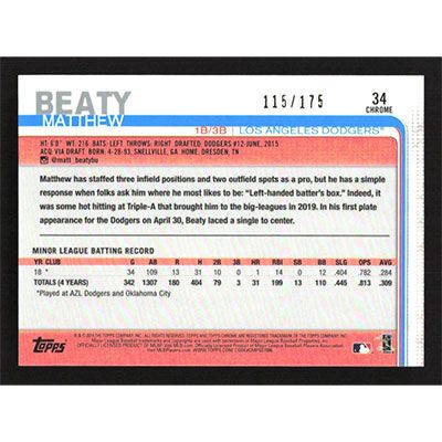 This is a 2019 Topps Chrome Update Purple Refractors Matthew Beaty baseball card. The card is #34 and pictures show condition. This card is limited; #'d 115/175.