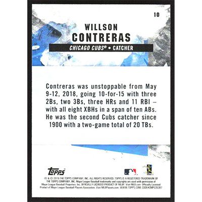 This is a 2019 Topps Fire Willson Contreras baseball card. The card is #10 and pictures show condition.