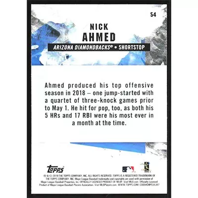 This is a 2019 Topps Fire Nick Ahmed baseball card. The card is #54 and pictures show condition.