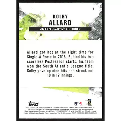 This is a 2019 Topps Fire Kolby Allard baseball card. The card is #7 and pictures show condition.