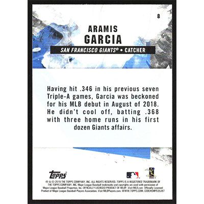 This is a 2019 Topps Fire Aramis Garcia baseball card. The card is #8 and pictures show condition.