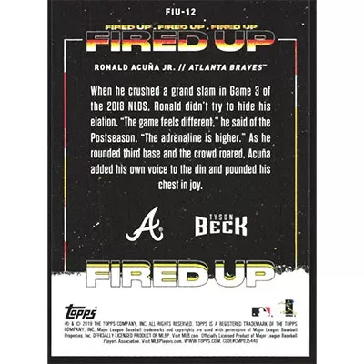 This is a 2019 Topps Fire Fired Up Gold Mint Ronald Acuña Jr. baseball card. The card is #FIU-12 and pictures show condition.