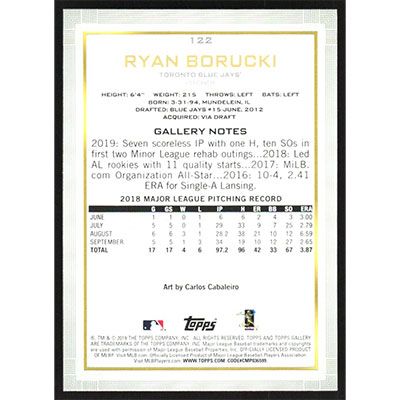 This is a 2019 Topps Gallery Ryan Borucki baseball card. The card is #122 and pictures show condition.