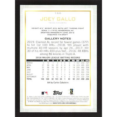 This is a 2019 Topps Gallery Joey Gallo SP - Artisans baseball card. The card is #166 and pictures show condition.