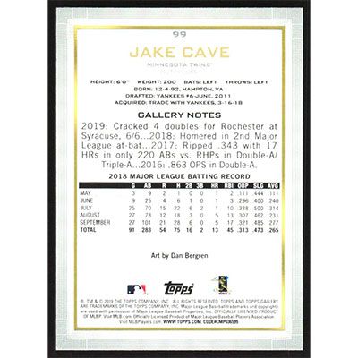 This is a 2019 Topps Gallery Jake Cave baseball card. The card is #99 and pictures show condition.