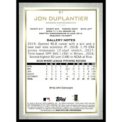 This is a 2019 Topps Gallery Artist Proof Jon Duplantier baseball card. The card is #21 and pictures show condition. Team(s): Arizona Diamondbacks Rookie Card (RC)