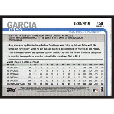 This is a 2019 Topps Gold Greg Garcia baseball card. The card is #450 and pictures show condition. This card is limited; #'d 1530/2019. Team(s): San Diego Padres