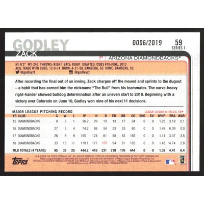 This is a 2019 Topps Gold Zack Godley baseball card. The card is #59 and pictures show condition. This card is limited; #'d 0006/2019. Team(s): Arizona Diamondbacks