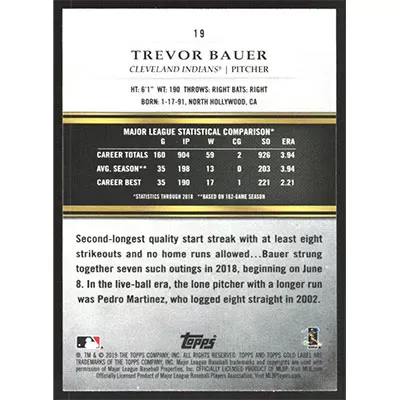 This is a 2019 Topps Gold Label Class 1 Trevor Bauer baseball card. The card is #19 and pictures show condition.