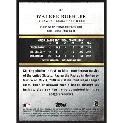 This is a 2019 Topps Gold Label Class 1 Walker Buehler baseball card. The card is #87 and pictures show condition.