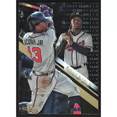 This is a 2019 Topps Gold Label Class 1 Black Ronald Acuña Jr. baseball card. The card is #7 and pictures show condition.