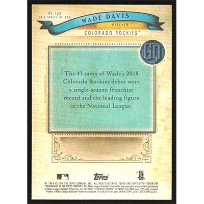 This is a 2019 Topps Gypsy Queen Wade Davis baseball card. The card is #135 and pictures show condition.