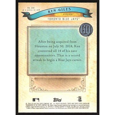 This is a 2019 Topps Gypsy Queen Ken Giles baseball card. The card is #281 and pictures show condition.