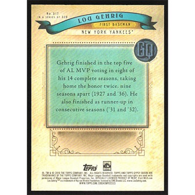This is a 2019 Topps Gypsy Queen Lou Gehrig short print baseball card. The card is #317 and pictures show condition.
