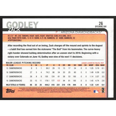 This is a 2019 Topps Opening Day Blue Foil Zack Godley baseball card. The card is #26 and pictures show condition.