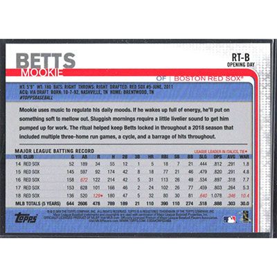 This is a 2019 Topps Opening Day Rally Time Mookie Betts super short print baseball card. The card is #RT-B and pictures show condition. Team(s): Boston Red Sox