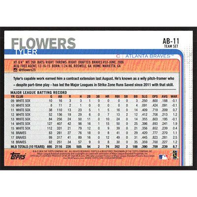 This is a 2019 Topps Team Sets Tyler Flowers baseball card. The card is #AB-11 and pictures show condition.