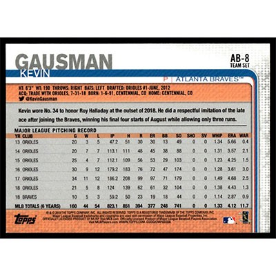 This is a 2019 Topps Team Sets Kevin Gausman baseball card. The card is #AB-8 and pictures show condition.