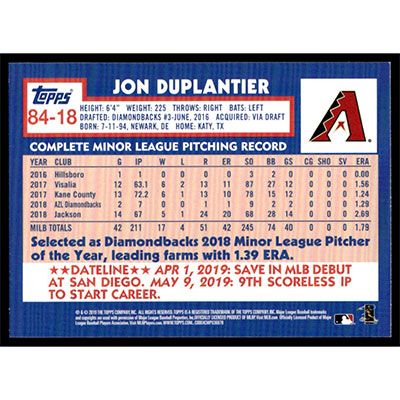 This is a 2019 Topps Update '84 Jon Duplantier baseball card. The card is #84-18 and pictures show condition. Team(s): Arizona Diamondbacks Rookie Card (RC)