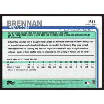 This is a 2019 Topps Update Brandon Brennan baseball card. The card is #US11 and pictures show condition.