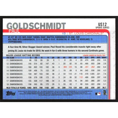 This is a 2019 Topps Update Paul Goldschmidt baseball card. The card is #US12 and pictures show condition.