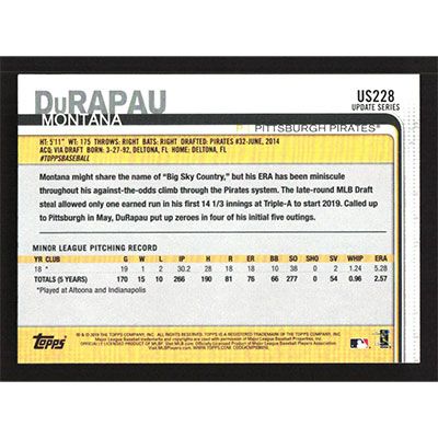 This is a 2019 Topps Update Montana DuRapau baseball card. The card is #US228 and pictures show condition. Team(s): Pittsburgh Pirates Rookie Card (RC)