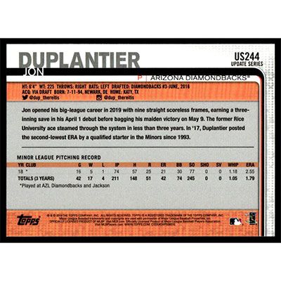 This is a 2019 Topps Update Jon Duplantier baseball card. The card is #US244 and pictures show condition. Team(s): Arizona Diamondbacks Rookie Card (RC)