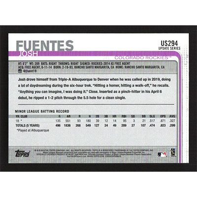 This is a 2019 Topps Update Josh Fuentes baseball card. The card is #US294 and pictures show condition.
