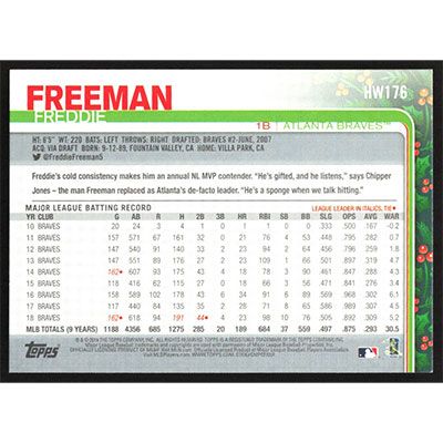 This is a 2019 Topps Wal-Mart Holiday Freddie Freeman baseball card. The card is #HW176 and pictures show condition.