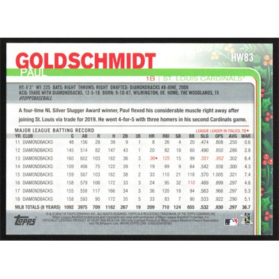 This is a 2019 Topps Wal-Mart Holiday Paul Goldschmidt baseball card. The card is #HW83 and pictures show condition.