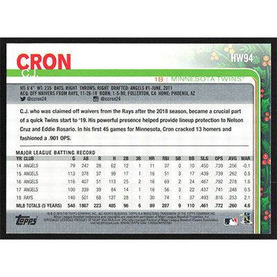 This is a 2019 Topps Wal-Mart Holiday C.J. Cron baseball card. The card is #HW94 and pictures show condition.