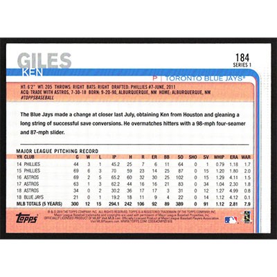 This is a 2019 Topps Walgreen's Yellow Ken Giles baseball card. The card is #184 and pictures show condition.