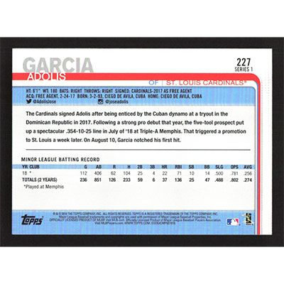 This is a 2019 Topps Walgreens Yellow Adolis Garcia baseball card. The card is #227 and pictures show condition. Team(s): St. Louis Cardinals Rookie Card (RC)