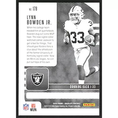This is a 2020 Absolute Lynn Bowden Jr. football card. The card is #178 and pictures show condition.