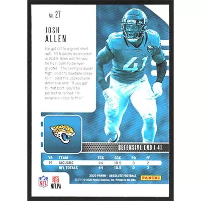 This is a 2020 Absolute Josh Allen football card. The card is #27 and pictures show condition.