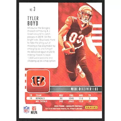 This is a 2020 Absolute Tyler Boyd football card. The card is #3 and pictures show condition.